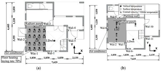 Figure 4a,b show the 1st and 2nd floor plan (1F and 2F) and actual measurement points of the experimental housing. Although the experimental housing was three stories in height, partitions were set up in the staircase between the 2nd and 3rd floors, and only the 1st and 2nd floors were measured. In addition, the 2nd floor living room also contained partitions in the same position as the staircase. There was a staircase with a stairway on the 1st floor which was adjacent to the living room on the 2nd floor. In addition to the convection type air conditioner (room air conditioner) and the radiant heating panel, under-floor heating was laid in only one room on each floor with an attendant floor laying rate of 70%. These rooms are marked by the shaded areas in Figure 4. At each measurement point, the in-space temperature, the surface temperature, the air movement speed, and the globe temperature were measured at one-minute intervals.
