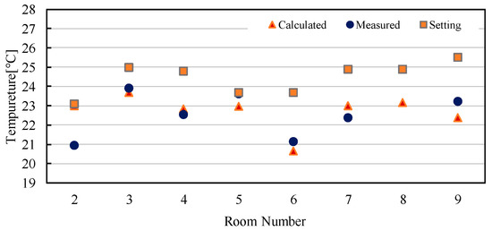 Figure 6 shows the area-weighted average value of the inner surface temperatures of the THERB calculated value and the measured value. The measured values and the surface temperature from THERB were roughly similar; however, slight differences were seen in Room 2 and Room 8. It was proposed that this was because the temperature under the floor was not included as an input condition, which differed from the actual measurement situation.