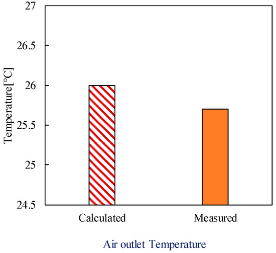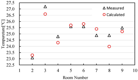 Figure 8 shows the accuracy verification results of the temperature distribution characteristics of each zone of the CFD. The values calculated using CFD agreed with the measured values with a high degree of accuracy. Although a deviation of approximately 0.8 °C was noted in the temperature of Room 8, it was confirmed that this was within the allowable range because the errors associated with the measuring equipment were large at the volume-weighted average temperature. That is, an error occurs because the volume of the divided area of the area is represented by one measurement point (the error of the measurement device alone is ±0.5 ° C). In addition, since the true value is not known, it is difficult to completely trust the volume-weighted average temperature because the error may propagate. Figure 9 shows the comparison between the measured and calculated air outlet temperature at an air inlet angle of 30°. The error between the actual measurement value (25.7 °C) of the air outlet temperature and the calculated value (26.0 °C) confirmed the high accuracy of the measured value, which possessed a margin of error of 0.3 °C. It was also confirmed that the flow rate calculated using THERB and the total thermal load were correct.