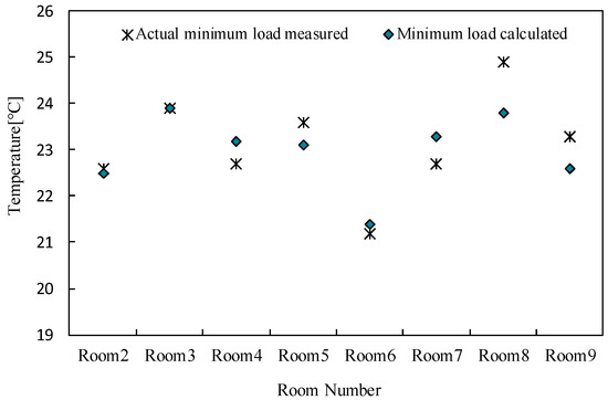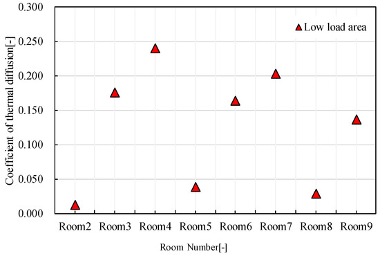 We used the surface temperature calculated in Section 4.2 to calculate the distribution coefficient, taking into consideration the cases where the heat load was at either a maximum or minimum. The boundary conditions of CFD at the lowest load are shown in Figure 10. The high correlation between the measured and calculated values confirmed that the boundary conditions were appropriate. The coefficient of thermal diffusion at the lowest load is shown in Figure 11. The coefficient of Room 3, which is a high air-flow space, is the highest, and it could be confirmed that the heat moved by convection. As for Room 5 and Room 6, the heat spread to influence the zone of the next room through the air inlet and thus demonstrated higher values. It was confirmed that the difference between the maximum and minimum load was not too large. The CFD analysis result is shown in Figure 12. It could be confirmed that heat was transported to Room 4 of 2F due to the air flow from the air conditioner of Room 7 of 1F.