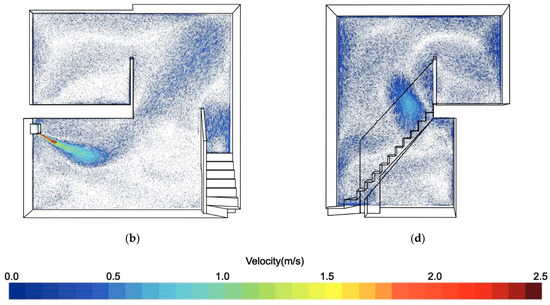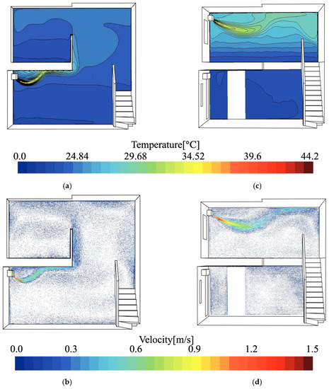 CFD analysis results (addition of heat sources). (a) Y = 1.5 m Temperature distribution (1F); (b) Y = 1.5 m Wind speed distribution (1F); (c) Y = 1.5 m Temperature distribution (2F); (d) Y = 1.5 m Wind speed distribution (2F).