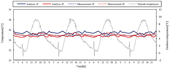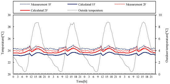 Figure 20 shows the result of the accuracy verification. The calculation results generally agreed with the measured values, and it could be concluded that the effectiveness of the heat source addition was confirmed. The calculated values were distorted compared with the measured values, but this was due to the heat load being distributed and added for each floor, so the waveform could not be captured due to the error in the coefficient of thermal diffusion. On average, it was found to be accurate because it fell within an error range of approximately 0.3 °C
