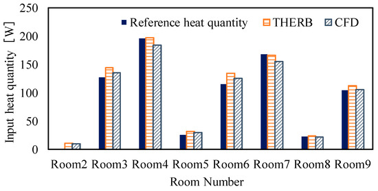 Although there was an error of approximately 1 °C in the maximum load time zone in Room 7, Room 4 fell within an error margin of approximately 0.6 °C. In the lowest load time zone, an error of approximately 0.7 °C occurred in Room 7 and an error of approximately 0.5 °C occurred in Room 4. A further difference between 1F and 2F can be seen in Figure 14. The actual heat load measurement value of each zone was set as the heating set temperature of the THERB at the minimum load time. This was the heat quantity actually required. The amount of input heat consisted of the product of specific heat, specific gravity, and the flow rate with the total load and CFD air inlet and outlet temperature difference. These were integrated values for each zone calculated by THERB in comparison with the reference heat quantity. The amount of input heat was distributed using the coefficient of thermal diffusion. Comparing the results, it was confirmed that both THERB and CFD generated the reference heat accurately. This result supported the validity of the coefficient of thermal diffusion.