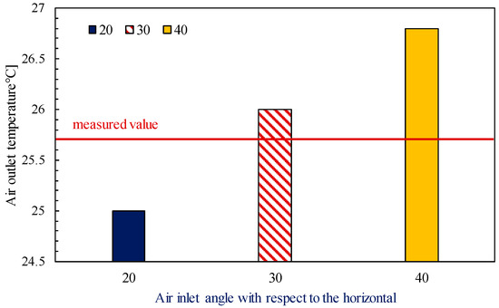 If the amount of heat input varies, it means that two variables would be used as part of the analysis conditions, compromising the planned sensitivity analysis. The air inlet temperature was changed by combining the amount of input heat with a 30° air inlet angle, which could not be compared without matching the amount of input heat. The convergence calculation was performed using CFD until the amount of input heat fell within an error margin of 8%. A comparison of the air inlet angle and the air outlet temperature is shown in Figure 15.