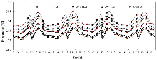 It was confirmed that the same tendency was observed at 20° and 40° as compared with the standard 30° case. It was proposed that it would change depending on the amount of heat input, rather than on the air inlet angle, and it could be predicted that it would depend largely on the flow rate. The sensitivity analysis results are shown in Figure 17. The temperature of the main room tended to be higher in the case where the air inlet angle was 20°. This was considered to be so because heat was distributed to a zone such as Room 2 when the air inlet angle became large. In fact, such a tendency can be seen in Figure 18. However, the temperature scale was within a range of approximately 0.5 °C, and even when the air flow direction changed, no significant differences were observed.