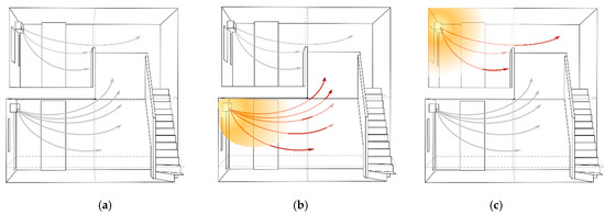 Depiction of heat source addition. (a) Reference condition (heat input 0 W); (b) Only 1F heat input; (c) Only 2F heat input.