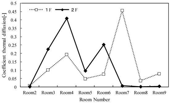 The temperature difference noted in the distribution between 1F and 2F when two air conditioners were in operation was small. It can be seen from Figure 19 that the air inlet flow velocity was different. This was due to the fact that the heat loads for 1F (480.7 W) and 2F (560.6 W) were different and that the opening area of the air conditioner outlets were different. From the calculation results, the flow rate for 1F was 1.29 m/s, and for 2F was 1.6 m/s. The flow rate for the air conditioner on each floor was calculated using Equation (5) presented in Section 4.2. It was determined that the heat loads and heat transfer coefficients of 1F and 2F were correct because they were confirmed by the fact that the actual value was duplicated by the accuracy verification result for the heat source addition as shown in Figure 20. The calculated value for the coefficient of thermal diffusion for each floor is shown in Figure 21. The heat transfer by the air conditioner affected Room 4 when the air conditioner operated on 1F. It could also be confirmed that it affected 1F when the air conditioner operated on 2F because of the heat transfer coefficient of Room 4 (2F) and Room 7 (1F), which were the main rooms. It was proposed that this was because heat was transported to an area other than the air conditioned floor by the advection of the air conditioner. It was difficult to calculate heat load using ES when forced convection prevailed and heat transfer was performed in a continuous manner in zones such as high air-flow spaces.