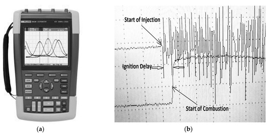 The oscilloscope utilized in the present investigation is an advanced two-channel oscilloscope as shown in Figure 2a. The combustion and the fuel injection processes are shown on separate channels as shown in Figure 2b. By adjusting the time scale, the ID can be measured on the screen of the oscilloscope by observing the distinction between the beginning of injection and the beginning of combustion. The details of oscilloscope are summarized in Table 4.