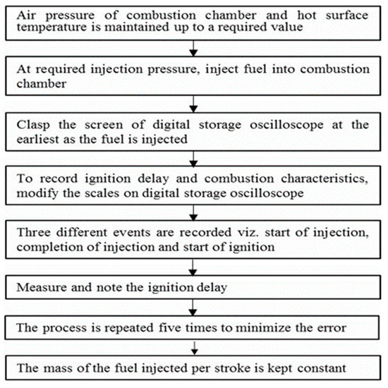 The air pressure of the combustion chamber is initially raised and sustained at the desired CAPs with the help of the compressor and the regulator. The surface temperature inside the combustion chamber is sustained at the desired HSTs via the heating element attached to the hot plate and temperature controller. At the point when there is no longer any combustion taking place inside the chamber, there is no light falling on the photosensor, and consequently, the signal from the oscilloscope is zero. A work approach of the present study is shown by the flowchart in Figure 3.