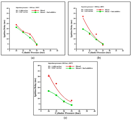 Ignition delay (ID) deviation of diesel and diesel with fuel additive at injection pressure 100 bar. (a) CAP 10-25, HST 350; (b) CAP 10-25, HST 400; (c) CAP 10-25, HST 450.