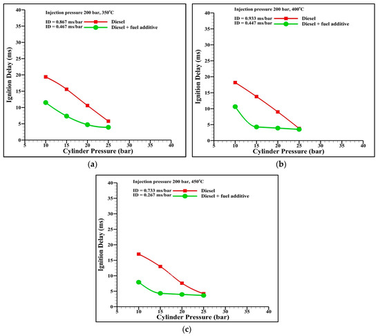 ID deviation of diesel and diesel with fuel additive at injection pressure 200 bar. (a) HST 350; (b) HST 400; (c) HST 450.