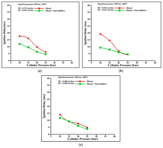 ID deviation of diesel and diesel with fuel additive at injection pressure 300 bar. (a) HST 350, Injection pressure 300; (b) HST 400, injection pressure 300; (c) HST 450, injection pressure 300.