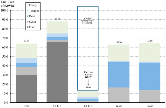 Generation plant technologies and associated plant costs are essential inputs to the security-constrained unit commitment model. Two key variables for each generation technology are (unit) marginal running costs and plant fixed and sunk costs, . These inputs have been derived from a power plant cost model (PF model—the logic of which appears in Appendix A). The PF model derives generation technology (generalized) long run marginal costs and total revenues including normal profit for a given level of output .
