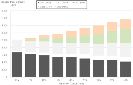 Given perfect entry, exit, and exogenously determined levels of government-initiated CfD’s to drive VRE market share, all scenarios are implicitly “long-run dynamic” as measured by the time taken for the capital stock to adjust, rather than specifying a notional time period per se as in [24,35]. The thermal plant stock is therefore assumed to adjust perfectly in that VRE plant entry is accommodated by coal plant retirements (“to make room”, and in line with coal plant financial distress arising from policy-induced VRE plant entry), while moderate levels of CCGT and OCGT plant enter to ensure reliability constraints are met given the intermittent nature of wind and solar PV.