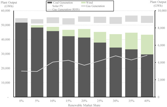 Figure 3 shows how plant output adjusts with the addition of wind and solar PV plant gradually reaching a 40% market share. Given limited variations in final demand, supply-side adjustment from VRE plant entry primarily comes from the exit of coal plant. Gas-fired plant capacity continuously rises (see Figure 2) but output responds to both the entry of VRE plant and the exit of coal plant. That is, gas generation (presented as a bar series on the LHS y-axis, and a line series on the RHS y-axis with higher axis resolution to emphasize the variation) provides system flexibility, rising as coal plant exits, and falling as VRE plant increases in output.