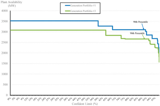 Results for Generation Portfolio #1 and Generation Portfolio #3 are presented in Figure 4. Notice that for the 3520 MW Generation Portfolio #1 (and by implication, Generation Portfolio #2 which has an identical plant portfolio) the total potential supply of hedges at the 90th percentile is about 3150 MW, and for the 3080 MW Generation Portfolio #3, total potential supply of hedges is about 2700 MW.