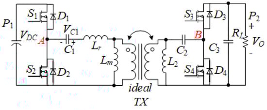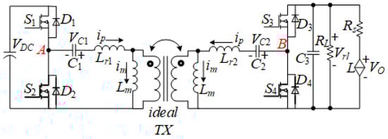 To analyse the forward power transfer mode, considering that the system is working under very high switch frequency, it can be equivalent as the half-bridge LLC resonant converter shown in Figure 4; the output port P is connected to the resister to simulate the load, and the driver signal is only given to switch S and S in complementary mode, the half-bridge combined by S and S working as an uncontrolled rectifier, power flows from P to P.