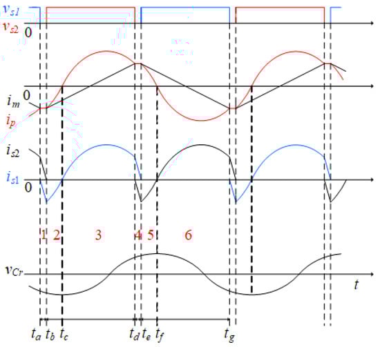 To realize the linear control of the transfer power, the frequency of the driving signal on S and S should be higher than the first resonant frequency: f > f. In this case, the system can be divided into six working modes in a switching cycle. The theoretical waveform is shown in Figure 5. Where v and v are the driving signal of the switch S and S, i is the current in the leakage inductance L, i and i are the currents flowing in the switches S and S, respectively; v is the voltage on the resonant capacitor C.