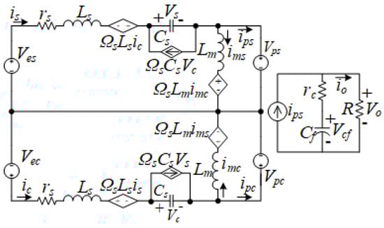 A frequency control method is proposed to control the output voltage of the forward power transfer. To realize the digital control of this system, a small signal model of the system is built, separating the output of the half-bridge inverter into a sine and a cosine voltage source, and the equivalent simplified circuit is shown in Figure 9.