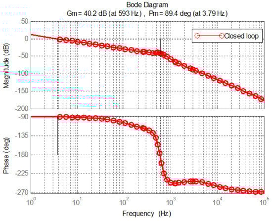 The bode diagram can be easily obtained as shown in Figure 11, from which the crossing frequency of the system is 593 Hz, and the phase margin is 89.4 degrees, system stability requirement is satisfied and therefore the closed loop system can work stably.