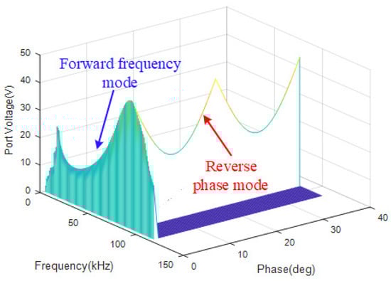 In order to get the characteristics of the forward power transmission mode, an open-loop system model built in PSIM is proposed to sweep the switching frequency to obtain the system characteristics upon frequency. For the forward power transfer, only S and S are driven by the driven signal, S and S just in function as the half-bridge rectifier, output resistor R = 8 Ohm, consider the parameters chosen, the first resonant frequency f = 225 kHz, and the second resonant frequency f = 80 kHz. Thus, sweeping the switching frequency between 0 Hz and 300 kHz, and the characteristic curve can be obtained as Figure 14.