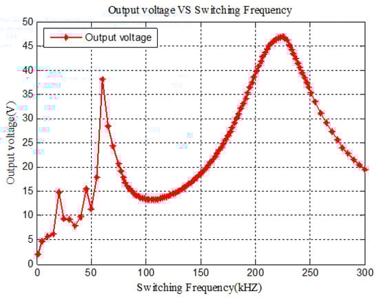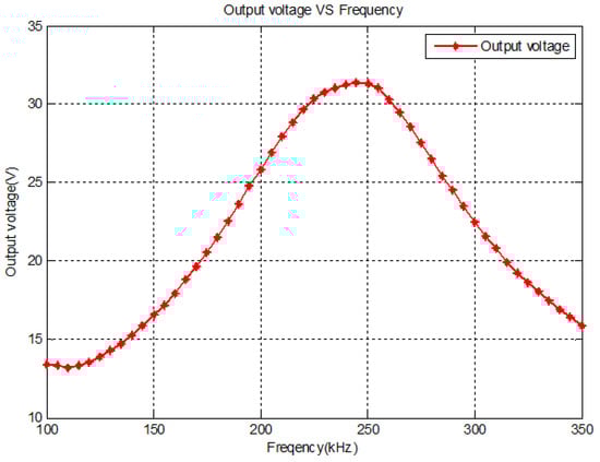 Based on the simulation results of the forward power transfer mode, the experiment of the frequency sweep is carried out. Considering the system parameters, set the switching frequency at the range of 100–350 kHz, and the output voltage curve can be obtained in Figure 21. The diagram is similar to the simulation results and the system characteristics are verified.