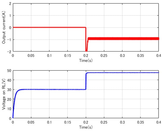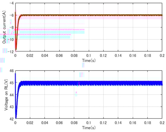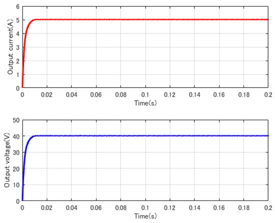 In order to verify the correctness and accuracy of the controller, the closed loop system is built in MATLAB (R2017a, MathWorks, Inc, Natic, MA, USA). The reference output voltage 40 V, the output voltage and current waveform can be seen in Figure 15, and it can be concluded that the control system achieves the desired efficiency.