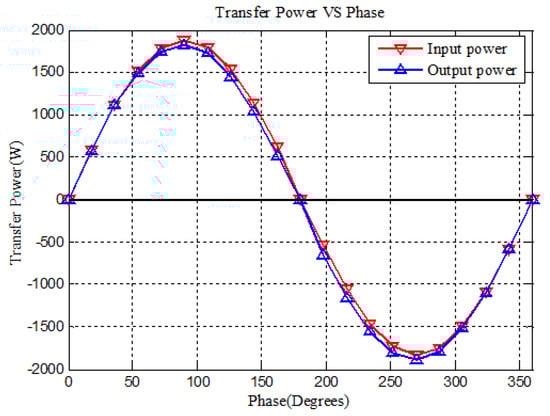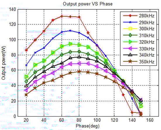 This experiment is proposed to verify the bidirectional power transfer of the system; as in reverse power transfer mode, the switching frequency is higher than the first frequency. The drive signal of S and S leads the phase; sweep the phase from 30 degrees to 360 degrees under different switching frequency, the curve of the transfer power along with the phase can be obtained in Figure 25.