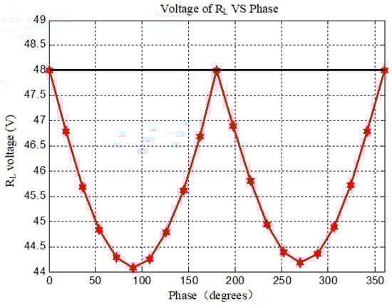 In the reverse power transfer mode, the phase shift method is applied with S and S are driven together and ahead of the S and S drive signal. The open-loop simulation is built in PSIM to get the characteristic of the power transmission among phase shift. The parameter is the same as the forward simulation mode, and the load is changed to be the source load, 48 V DC load is connected to the output port. The simulation makes S and S drive signal lead ahead than the signal of S and S, scan the phase from 0 to 360 degrees, and the curve of the input and output power along with the phase is shown in Figure 16, and the curve of the voltage on R shown in Figure 17.