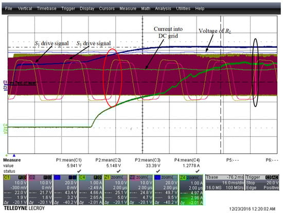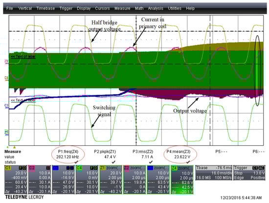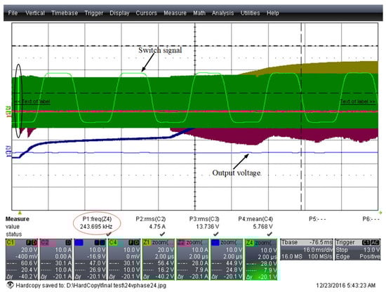 The closed-loop experiment is based on the open-loop sweep results, where the switching frequency setting is higher than the first resonant frequency. At the beginning, the initial frequency of the system is set to 244 kHz and the initial system waveform is shown in Figure 22, where the system frequency is 243.695 kHz.