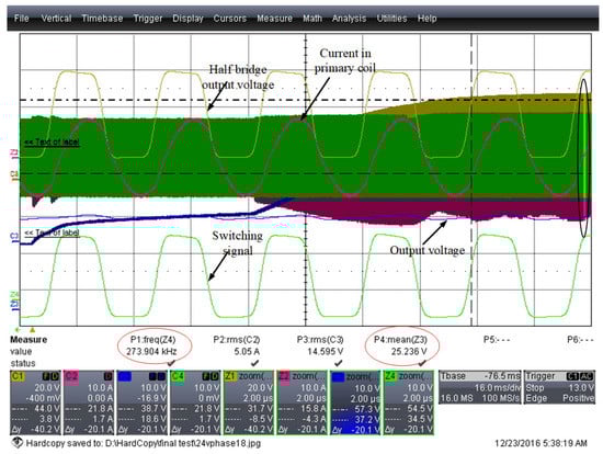 As can be seen, a reverse voltage is applied to turn off the switch. To verify the effectiveness of the control system, control the system output voltage at 25 V and 23 V, respectively; the waveforms are shown in Figure 23 and Figure 24, respectively. From the waveforms, the output voltage is 25 V, the system switching frequency is 273.9 kHz, while the output voltage of 23 V and the frequency is 282.12 kHz. The results meet the open-loop sweep result. Therefore, the control system is efficient and verified.