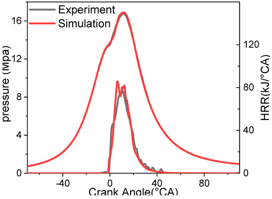 Figure 2 shows the comparison between the calculated and measured in-cylinder pressure and heat release rate profiles. As seen in the figure, generally good agreement between simulation and experiment was obtained. Detailed comparisons of the main combustion characteristics are presented in Table 3. The maximum error for the maximum in-cylinder pressure (Pmax) phasing was 5.6%, while the simulated combustion phasing (CA50), indicating the specific fuel consumption, and NOx and CO emissions were all very close to those of the experimental data, indicating that the model setup was reasonable and reliable.
