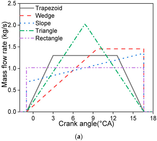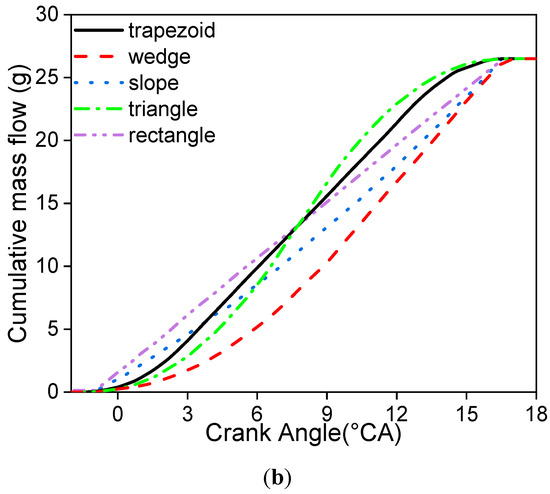 In this study, five different natural gas injection rate shapes were selected to evaluate the effects of different injection rate shapes on combustion and emission characteristics. Figure 3a shows five different injection rate shapes of natural gas, and Figure 3b shows the cumulative mass flow rate of the corresponding injection rate shapes, wherein the trapezoid shape was the base case.
