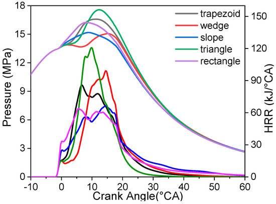 The in-cylinder pressure and heat release rate profiles for five different injection rate shapes are shown in Figure 4. It can be seen that the injection rate shape had a significant influence on the heat release rate. Compared with the base case (trapezoid shape), the initial injection rates of the rectangular and sloped shapes were higher, hence the initial heat release rates and initial pressure rise rates also being higher. However, the peaks of in-cylinder pressure profiles were lower and the combustion duration was longer due to the lower maximum injection rates. Since the initial injection rates of the slope shape and rectangle shape were higher compared with the base case, more natural gas was entrained into the diesel–air mixture, and more natural gas was consumed in the initial combustion duration. Therefore, the initial pressure rise and initial heat release rate were higher, while the combustion phase was retarded due to the longer ignition delay periods. Since their initial injection rates were higher, more low-temperature natural gas was entrained into the diesel fuel mixture, the ambient temperature surrounding the diesel was lower, and natural gas consumed OH, thus prolonging the ignition delay periods. Therefore, the peaks of the in-cylinder pressure profile for the slope and rectangle shapes took place in a later phase. The in-cylinder pressure profile illustrated two peak values when adopting a wedge injection rate shape (the initial injection rate was relatively low), where the first peak was a consequence of the end of the compression stroke and the combustion of a small amount of fuel, whereas the second peak induced by the heat released from most of the natural gas occurred after a drop caused by the downward movement of the piston in the expansion stroke. The peaks of the heat release rate profiles for the triangle and wedge shapes were higher than the base case due to their higher maximum injection rates. The highest maximum injection rate of the triangle shape led to the highest peak values of heat release rate and in-cylinder pressure profiles.