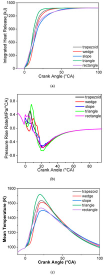 The effects of different injection rate shapes on (a) integrated heat release, (b) pressure rise rate, (c) and in-cylinder mean temperature.