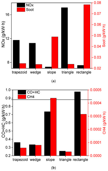 (2) The lower NOx emissions of the rectangle and slope shapes were beneficial due the lower combustion temperature, but their ISFCs increased. The emissions of soot, CO + HC, and CH4 of the rectangle and slope shapes were higher.
