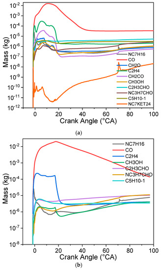 CO and HC are the intermediate species of the oxidation of fuel, and their fluctuations are consistent with soot emissions. The CO + HC emissions of the rectangle shape were highest owing to its lowest mean in-cylinder temperature and lower maximum injection rate. The lowest mean in-cylinder temperature indicated that the in-cylinder reaction rates were slower, and the lower injection rate led to fuels concentrating in a small region. More fuels were consumed in incomplete combustion as a consequence of the above two effects; thus, CO + HC emissions were higher. The CO + HC emissions of the triangle shape were the lowest due to its highest maximum injection rate and highest peak value of mean in-cylinder temperature profile. The maximum injection rate and the peak values of mean in-cylinder temperature profiles for the trapezoid and wedge shapes were slightly lower than those of the triangle shape but higher than those of the other two cases. Therefore, CO + HC emissions were slightly higher than the triangle shape but lower than the other two cases. Methane (CH4) is a greenhouse gas, which has a greater effect than CO2. Since CH4 is the primary component of natural gas, CH4 emissions are directly related to ISFC. The trend of CH4 emissions was associated with the emissions of soot and CO + HC. The CH4 emissions of the triangle shape were relatively low, and the CH4 emissions of the wedge shape and base case were just slightly higher than those of the triangle shape. It should be noted that the impact of natural gas leakage was not considered in the simulation. CH4 emissions are derived from unburned methane in the excessively lean equivalence ratio regions. The flammability limit of methane is relatively wide [61], hence the calculated CH4 emissions being lower than the experiment (2 g/kW·h). Figure 8 compares the formation of the main intermediate species of the rectangle shape (a) and the triangle shape (b). C7, C5, and C4 of the rectangle shape were higher. Since lower alkanes are difficult to combine into higher alkanes, the C7, C5, and C4 were mainly derived from the oxidation of diesel. Due to higher initial injection rate of the rectangle shape, more low-temperature natural gas was entrained into the burning region, which had a negative effect on combustion. The intermediate species with a high carbon number increased, which was consistent with combustion analysis discussed in Section 3.1. Therefore, a lower initial gas injection rate is beneficial for reducing CO + HC emissions.
