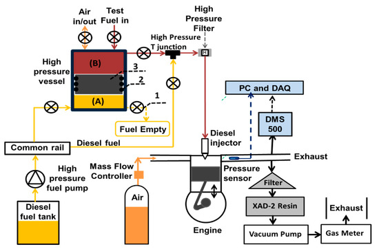 A conventional diesel fuel system was used as a hydraulic system to deliver pressurized diesel fuel to chamber A of the fuel vessel. The pressurized diesel fuel acted as a hydraulic fluid which created pressure in the test fuel via the moveable free piston, as shown in Figure 1. The O-rings (2), installed circumferentially on the surface of the piston, ensured that there was no mixing of test fuel and the diesel fuel. The diesel fuel was pressurized to a precise level using the Emtronix EC-GEN 500 engine control system (ECU) and the free moving piston always communicated this pressure to the test fuel. A high-pressure filter was installed between the fuel vessel and the fuel injector to prevent any damage to the injector by potential debris in the test fuel. High pressure needle valves (1) were used to switch between the fossil diesel fuel and the test-fuels, with the diesel fuel providing baseline data and also used for flushing the fuel line and injector.