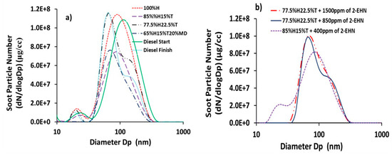 The profiles of soot particle number concentrations for the test fuels, sampled using the DMS500 particle spectrometer are shown in Figure 2. Figure 2a,b presents the distributions of soot particle number concentrations for the fuels without and with 2-EHN, respectively. Figure 2a shows that the soot particle sizes for all the fuels ranged from 30 to 360 nm without 2-EHN and, similarly, the range was 13–316 nm when 2-EHN was added to the fuel blends.