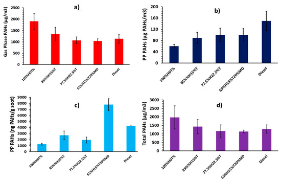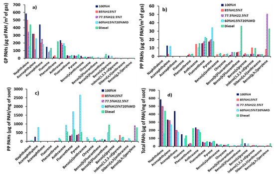 In Figure 3a, the most abundant exhaust PAHs found in the gas phase (GP) had two and three rings, irrespective of the fuel combusted. These PAHs included NPH, ACY, ACN, FLU, PHN and ATR. It is interesting to note the six most abundant PAHs listed above are group D members and, therefore considered to be non-mutagenic. The total sum of these six PAHs in the GP accounted for the bulk of the total PAHs in the case of all the fuels. For example, 91% in the case of the fuel 100%H, 94% in the case of the fuel 85%H15%T, 91% in the case of the fuel 77.5%H22.5%T, 80% in the case of the fuel 65%H15%T20%MD and 83% in the case of the fossil diesel fuel. These results of high proportions of the six PAHs (NPH, ACY, ACN, FLU, PHN and ATR) are consistent with those observed by He et al. [46] in a diesel engine fueled with biodiesel and diesel.