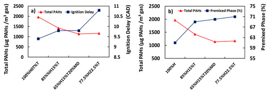 Figure 5a,b shows the variations of total PAHs with ignition delay and percentage premixed phase respectively. It is apparent from Figure 5a that increase in ignition delay due to corresponding increase in the proportion of toluene added to heptane was associated with decreased total PAH mass concentration. For example, the total PAH concentration for 100%H was 1966 µg/m3 and it decreased by 27% when the ignition delay was increased from 9.4 to 9.8 CAD in the case of 85%H15%T. This trend saw a further reduction by 41% in the total PAH emissions when the ignition delay was increased from 9.8 to 10.8 CAD in the case of 77.5%H22.5%T.