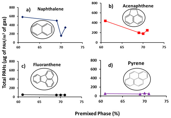 Profiles of Group D individual total PAH (µg PAH/m3 gas) with premixed phase (%) (a) naphthalene, (b) acenaphthene, (c) fluoranthene and (d) pyrene.