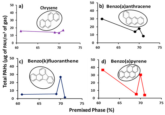 Profiles of Group B2 individual total PAH (µg PAH/m3 gas) with premixed phase (%) (a) chrysene, (b) benzo(a)anthracene, (c) benzo(k)fluoranthene and (d) benzo(a)pyrene.