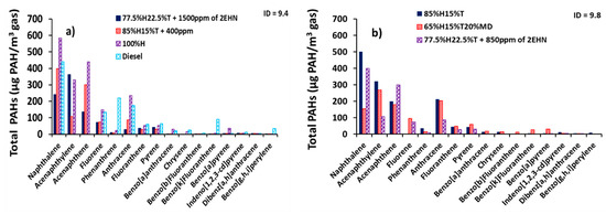 Distributions of total exhaust PAHs (GP + PP) (µg of PAH/m3 of gas) at constant ignition delay (a) ignition delay (ID) = 9.4 CAD and (b) ID = 9.8 CAD.