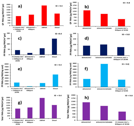 Comparing together Figure 9a–d, one can observe that adding 400 ppm of 2-EHN to 85%H15%T decreased the GP PAH concentration by 23% (Figure 9a,b) and the PP PAH concentration by 82% (Figure 9c,d). A similar observation can be seen when Figure 9e–h are compared. The PP PAH concentration on soot mass basis decreased by 95% (Figure 9e,f) while the total PAH concentration decreased by 26% (Figure 9g,h) when 400 ppm of 2-EHN was added to the 85%H15%T blend. The implication of this observation is that the addition of 2-EHN to the fuel blends results in early ignition reaction with high amount of energy liberated, and the PAHs associated with exhaust particulates and the gaseous species are considerably abated. However, it is interesting to note that addition of 2 EHN to any of the fuel blends appears, in most cases, to reduce PAH emissions, which could suggest a secondary effect on PAH formation. This is either through the presence of 2 EHN influencing, directly, the rates of PAH formation and growth reactions, or through the influence of 2 EHN on ignition delay.