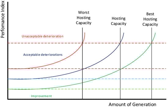 In Reference [], the authors define the hosting capacity approach as a transparent tool in order to communicate with stakeholders concerning the grid to which the DER is connected. An increasing number of studies have reiterated that the hosting capacity is “defined as the maximum amount of new energy generation, as well as energy consumption, which can be connected to the electrical grid without endangering its reliability or compromising power quality” [,,,,,,,,,,,,,,,,,,,,]. In other words, the hosting capacity is the amount of DER that can be integrated into a given system to the point where the performance index reaches its limits [,,,]. The maximum amount of generation can be classified as: The worst-hosting capacity, usual hosting capacity and the best-hosting capacity []. As shown in Figure 1, the curve range can be defined as the acceptable deterioration region between the best-hosting capacity ranges, which is attached to the best background distortion level of the system, and the worst-capacity range, which is attached to the worst background distortion level of the system, defines the region where it is possible to retain the system operational, free of uncertainties disturbances, while in respect to its limits index which depends on local standards.