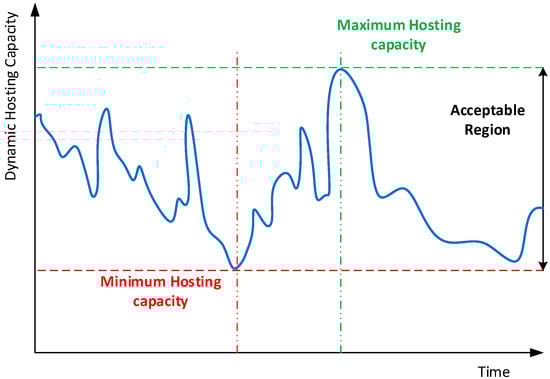 It is important to underline that the maximum amount of power depends on the harmonic voltage values, which are defined for each instant of time. A generic graph of DHC(t) is shown in Figure 2. Moreover, the time resolution in order to find the global value of the hosting capacity and its profile can be defined as daily, weekly, monthly, or even yearly.