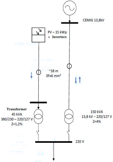 The studied system is composed of a 220 V feeder connected to a busbar, a 150 kVA transformer connected to 13.8 kV–220 V, and one PV system with 15 (Solar panels + Inverter + autotransformer) [,,]. The maximum PV generation is approximately 15 , even though the maximum load for the considered building is 4 kW since it was not fully operational. The exceeding power supply other buildings in the campus through the 13.8 kV distribution feeder. The electric schematic is shown in Figure 3. Table 1 shows the values of the factors for the simulations.