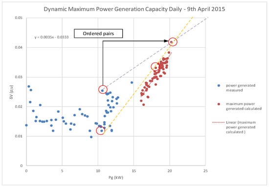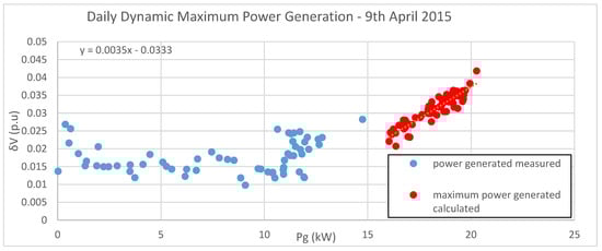 This method represents a useful and initial alternative to drawing the DHC(t) profile considering the day mentioned before, where for each instant of measurement, a maximum power generation, using Equation (6), has been calculated. Therefore, as stated earlier, a linear correlation is calculated for all these instants of time using the overvoltage margin as well as the measured power from the PV. These factors will be responsible for this result. Let us take a look at Figure 8 where an exemplification of the calculation of the daily DHC(t) is given.
