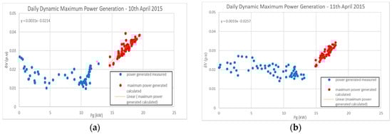 Voltage variation x generated power and the linear dependency in relation to the maximum amount of power calculated by Equation (5) for 10th of April 2015 and 11th of April 2015.